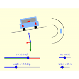 The simulation shows a car going around a banked turn. The car is, we hope, experiencing uniform circular motion, moving in a horizontal circle. In the simulation, you see the rear view of the car, an overhead view of the car, as well as the car's free-body diagram.